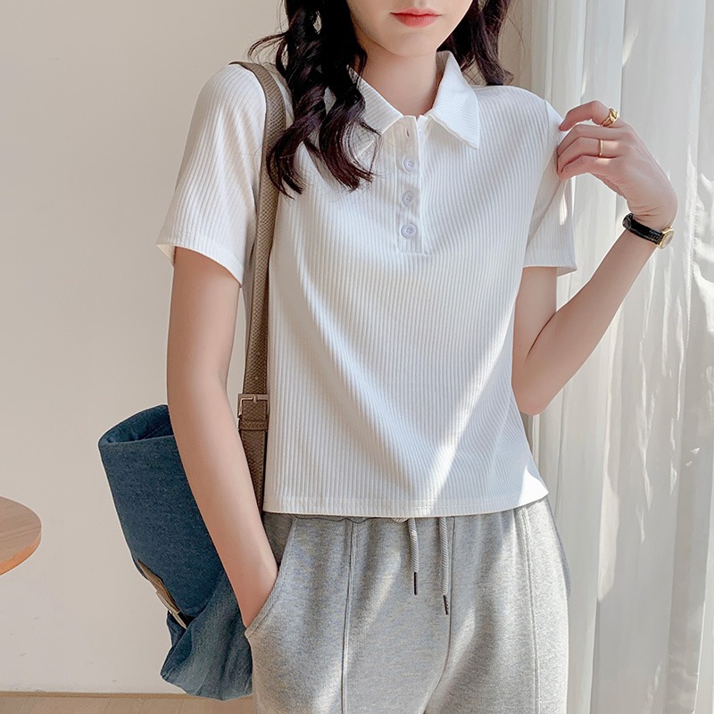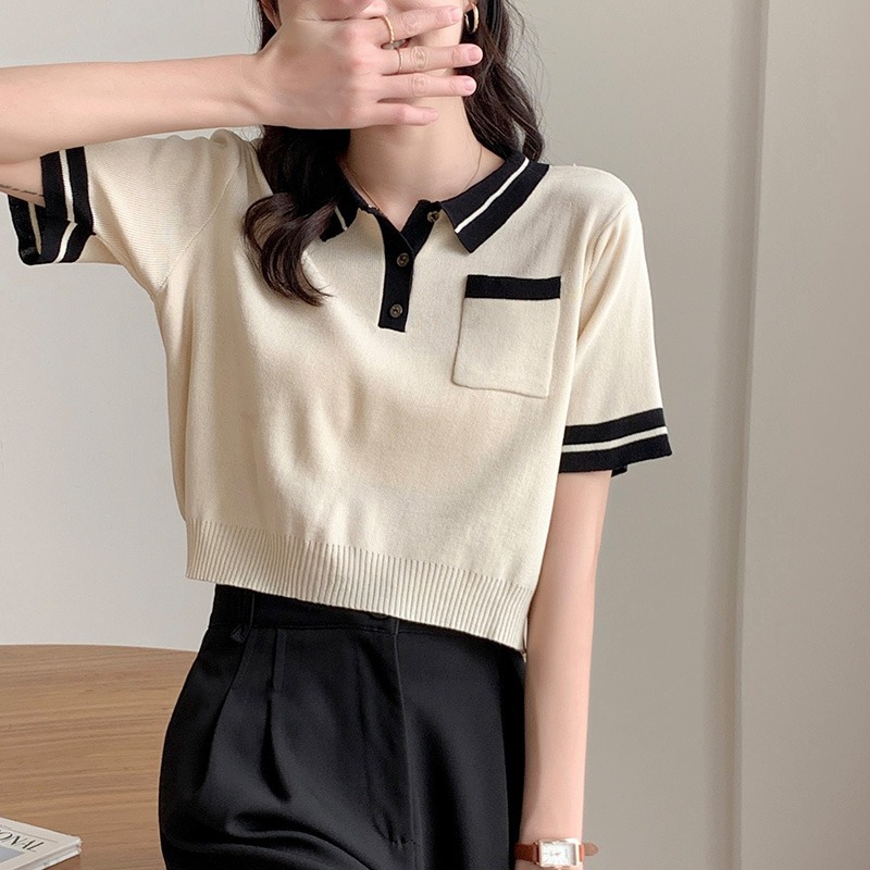 Polo襟ニット半袖tシャツ女性夏薄金2022新デザイン感小衆短金上服ins潮
