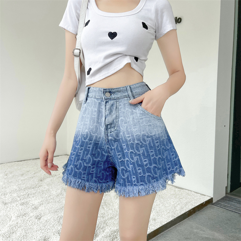 ヨーロッパのジャカードのグラデーション色のデニムの半ズボンの女性の夏の新型のハイウエストのゆったりしている毛の辺のa字の広い足のスカートのズボン