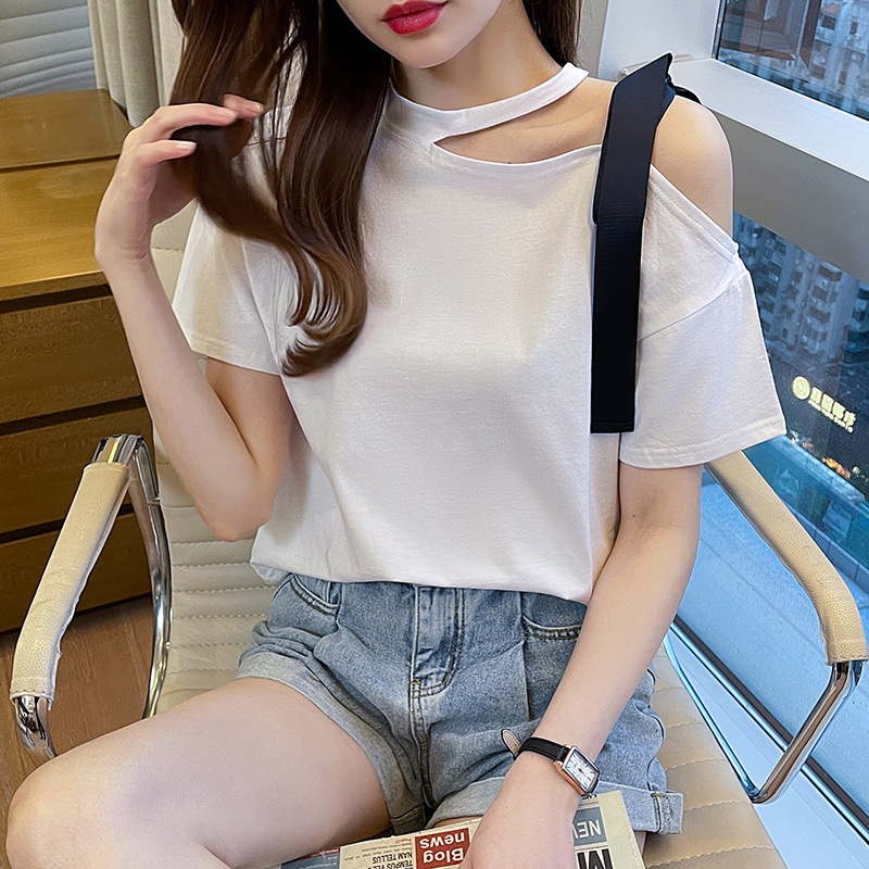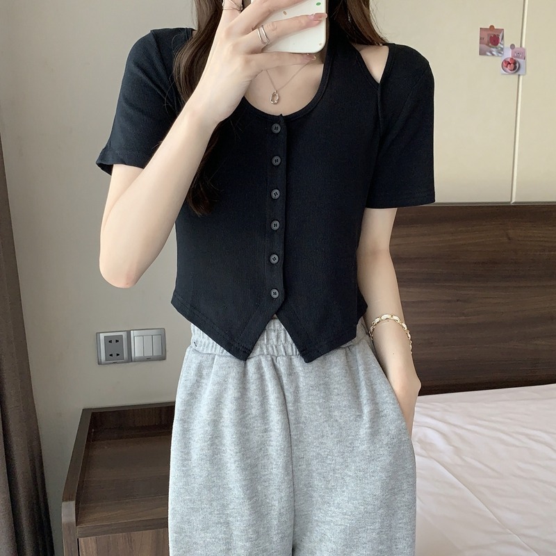 卸売り2022夏の新型半袖tシャツ女性高腰首の短いタイプの不規則なデザインの小さな上着の女性ins