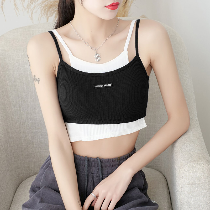 超火黒運動美背ストラップベスト女性の中に胸パッド付きのシャツを着て短いギャル上着を着ている