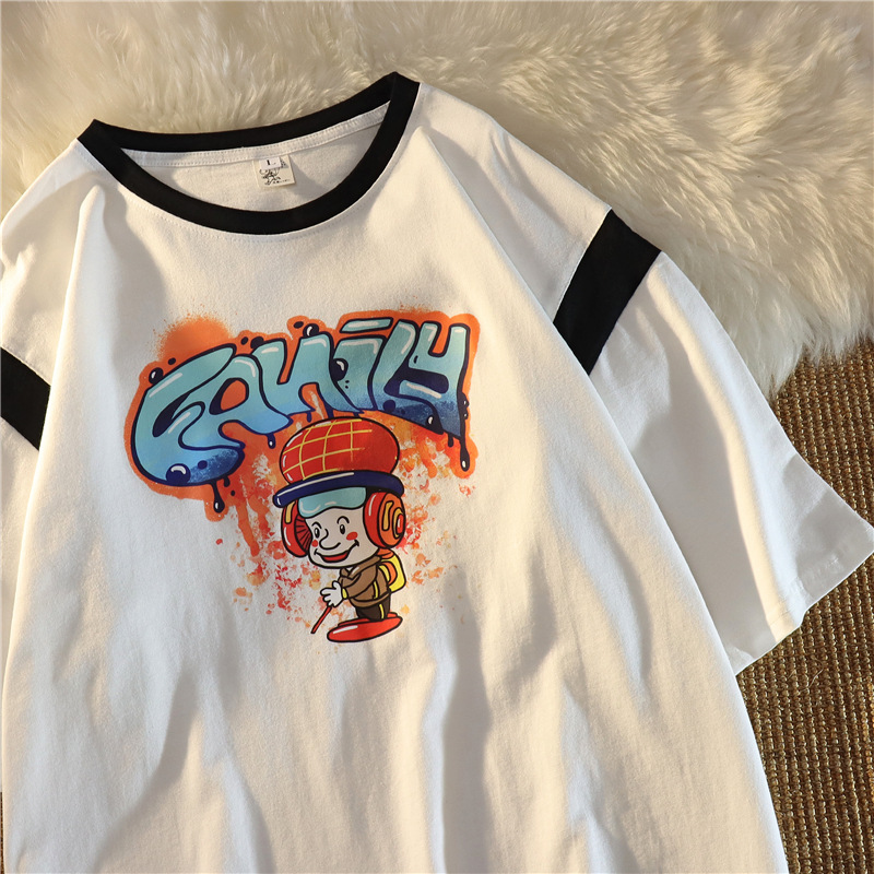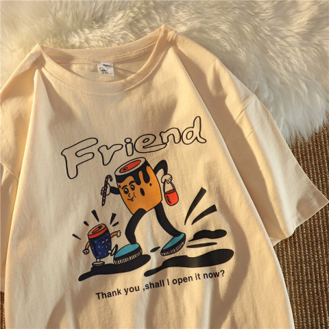 ベージュ色のレトロな漫画の純綿の半袖のtシャツの女性の2022新型の夏のゆったりしたchi港の味の原宿風の半袖