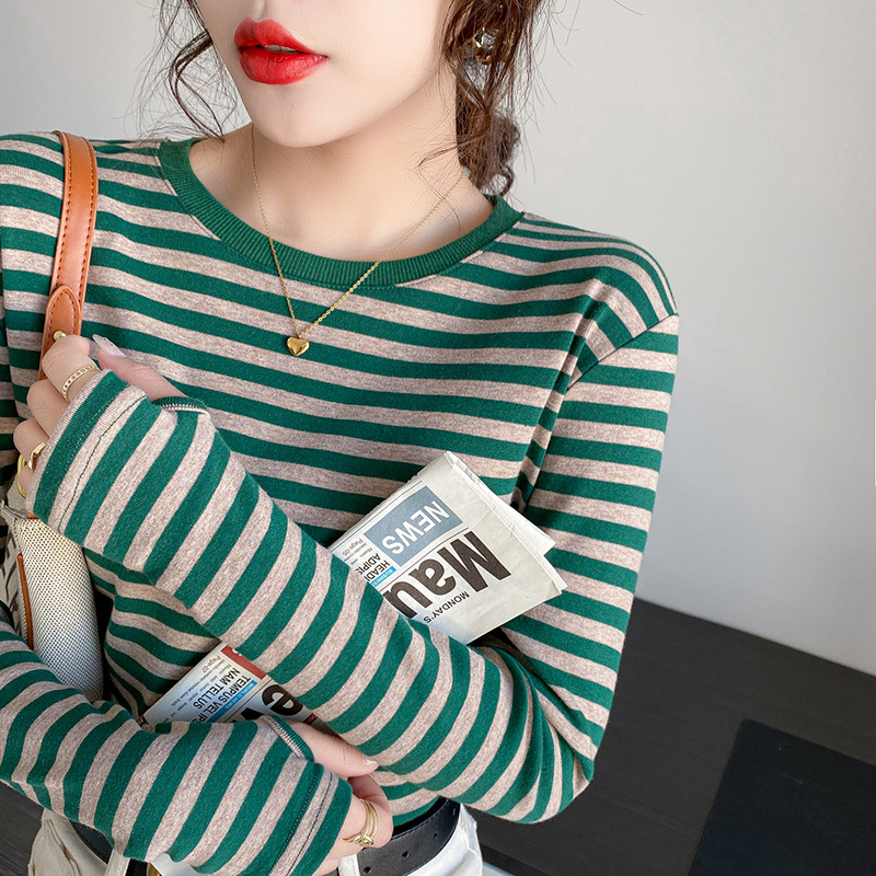 卸売りのストライプの底のシャツの女性の中で春秋2022の新型の衝突色の洋風の丸首の長袖のtシャツの百合の上着を掛けます。
