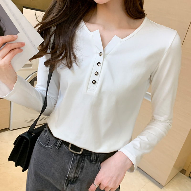 早春秋上着港味ins潮デザイン感小衆vネックtシャツ女性長袖白色純綿インナーシャツ