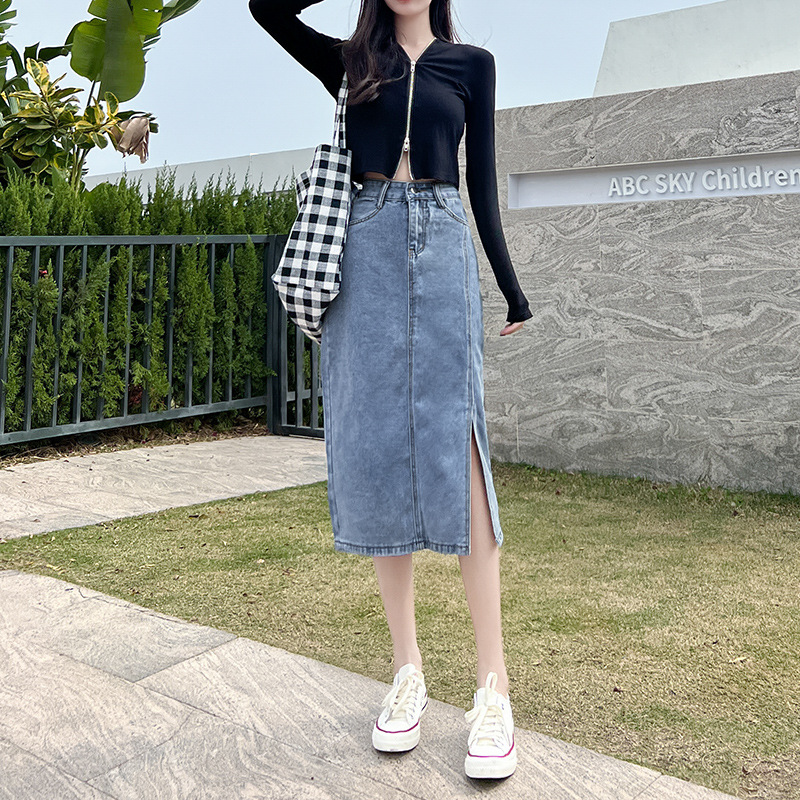 レトロなデニムの半身のスカートの春夏の女性の2022新型のデザイン感の小さい大衆の中で長いタイプの高腰のa字のオープンスカート