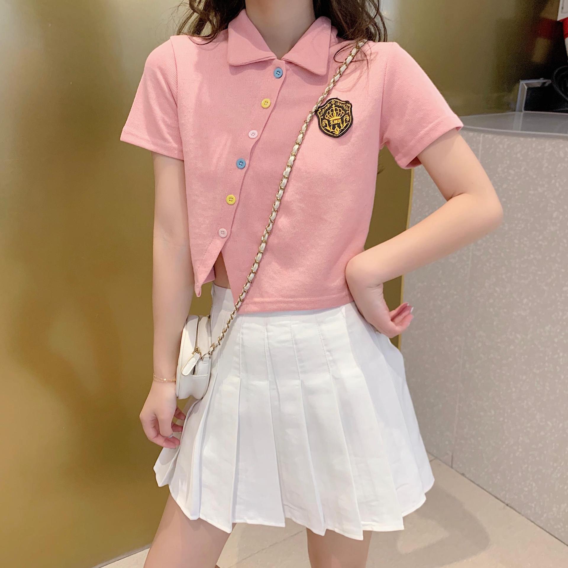 2023夏の新型poloシャツのデザイン感が小さい虹のボタンの短い服のtシャツの女性の上着