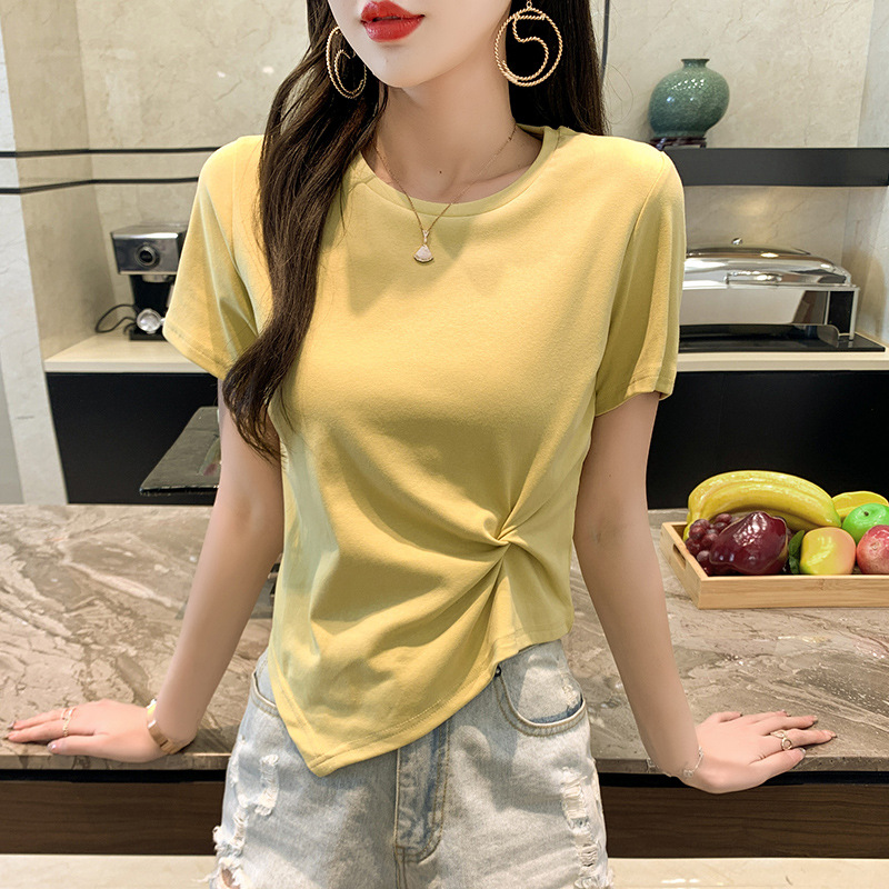注意機の透かし彫りのtシャツの女性の春の服の2022年の新型の純綿はやせています不規則なショートタイプの百合半袖の上着