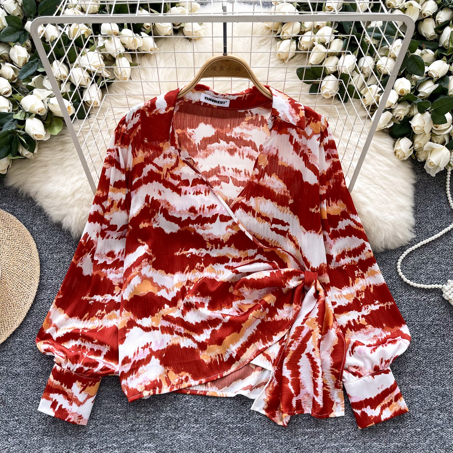通勤女性の百合減齢シャツ2025春のデザイン感クロスバンドは腰の洋風プリント長袖の上着を収めています。