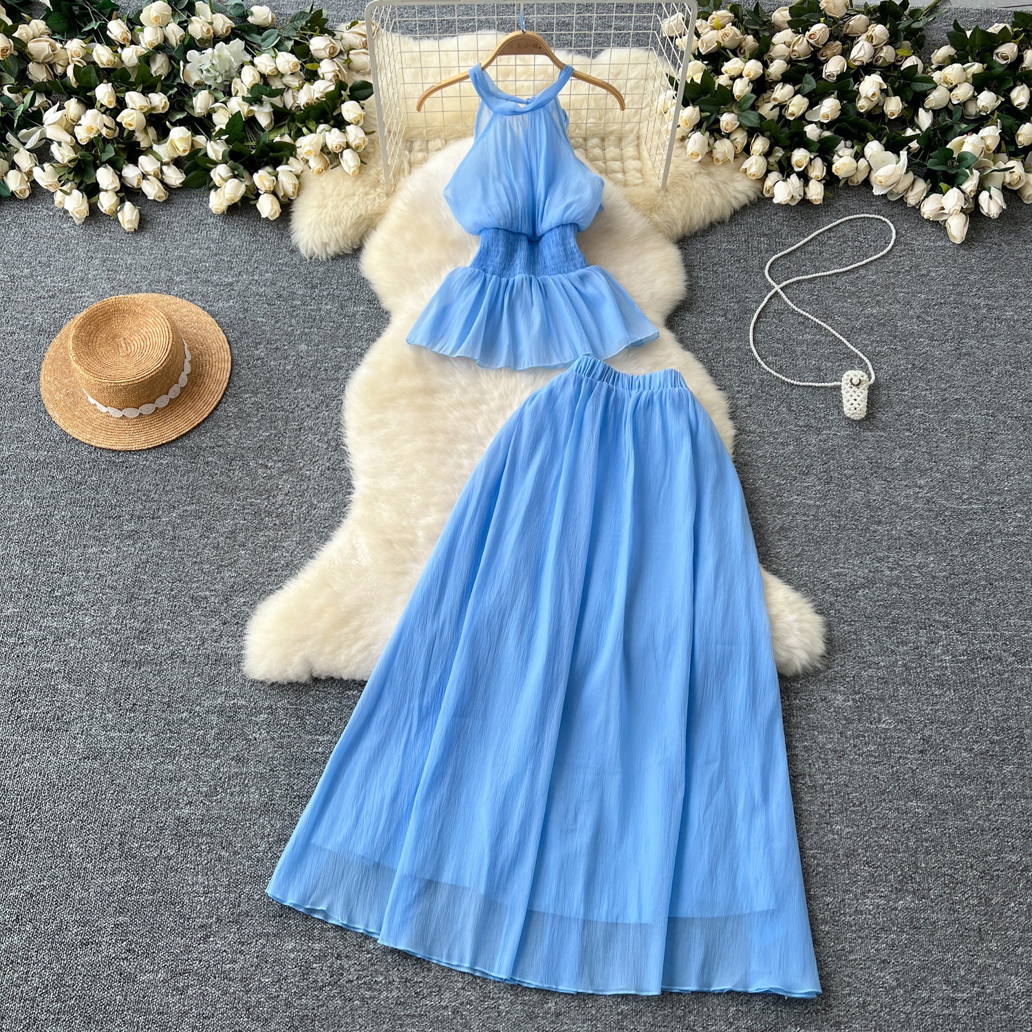 2025春の服装欧米の名媛の優雅なストラップは腰の灯籠の袖のプリントのシフォンの上着の高腰の大きい半身のスカートを収めます。