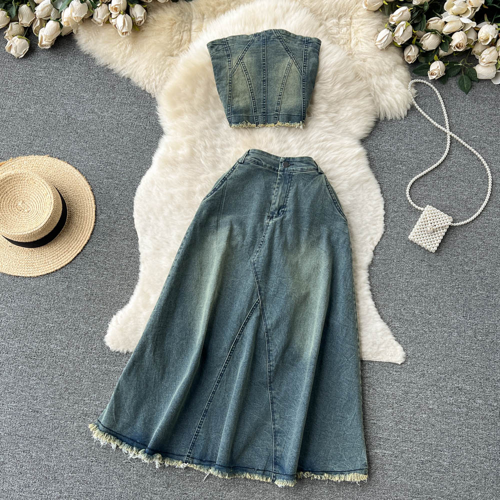 韓国系のレトロな雰囲気のデニムのスーツの女性はやせています。