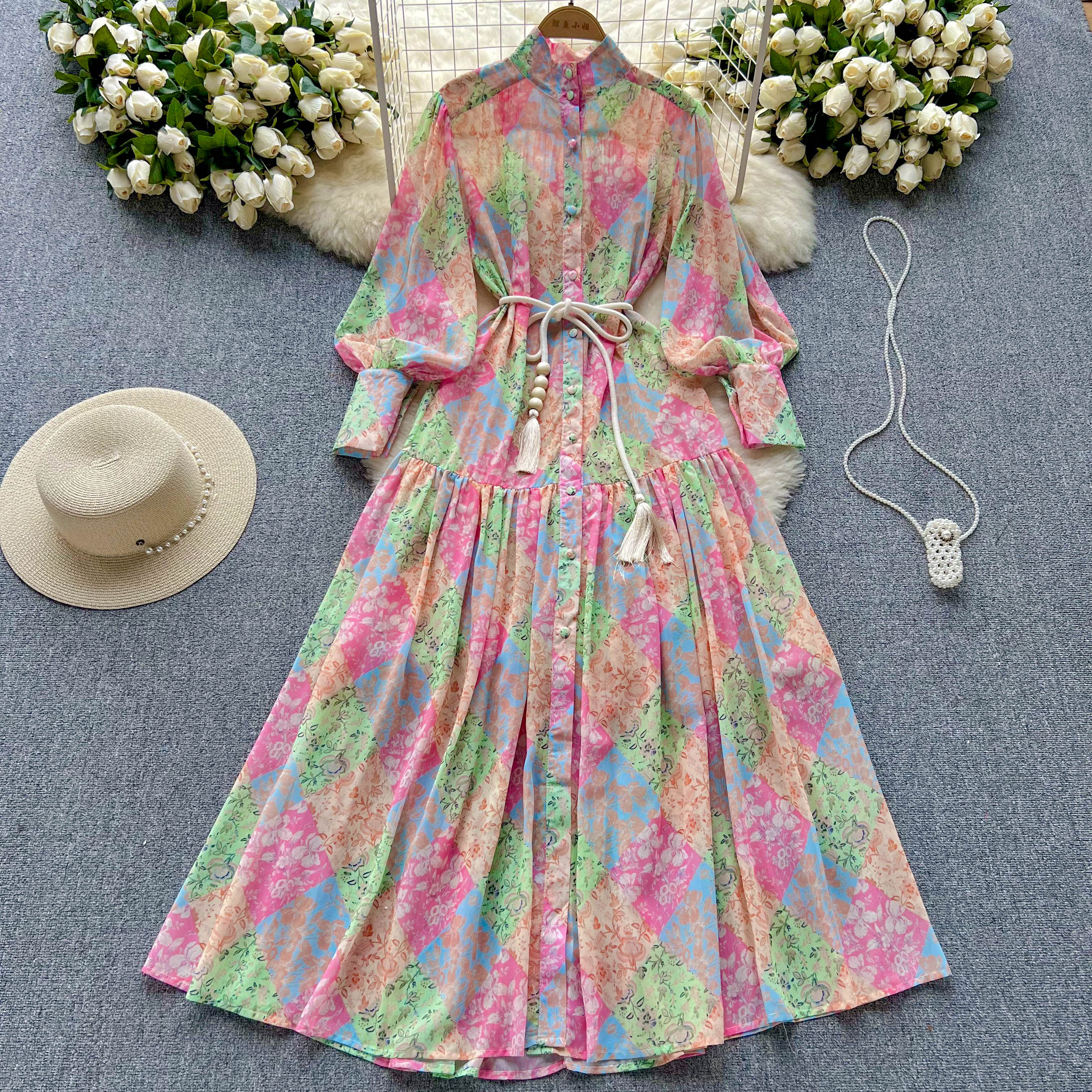 春と秋の薄い長袖の立襟の高級感のプリントのシフォンのワンピースの女性のゆったりとしたストラップは腰の休暇のロングスカートを収めます。