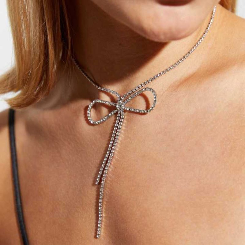 2023新型韓国版蝶結びのフリンジネックレスのシンプルなラインストーンのロックチェーンのフラッシュアクセサリー