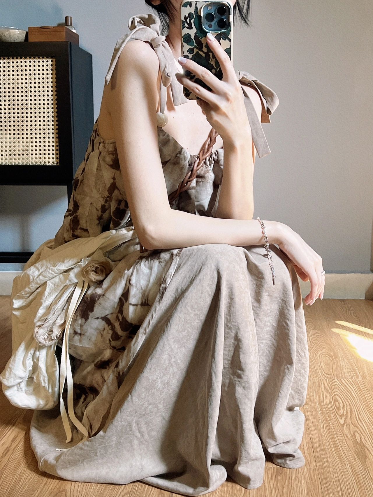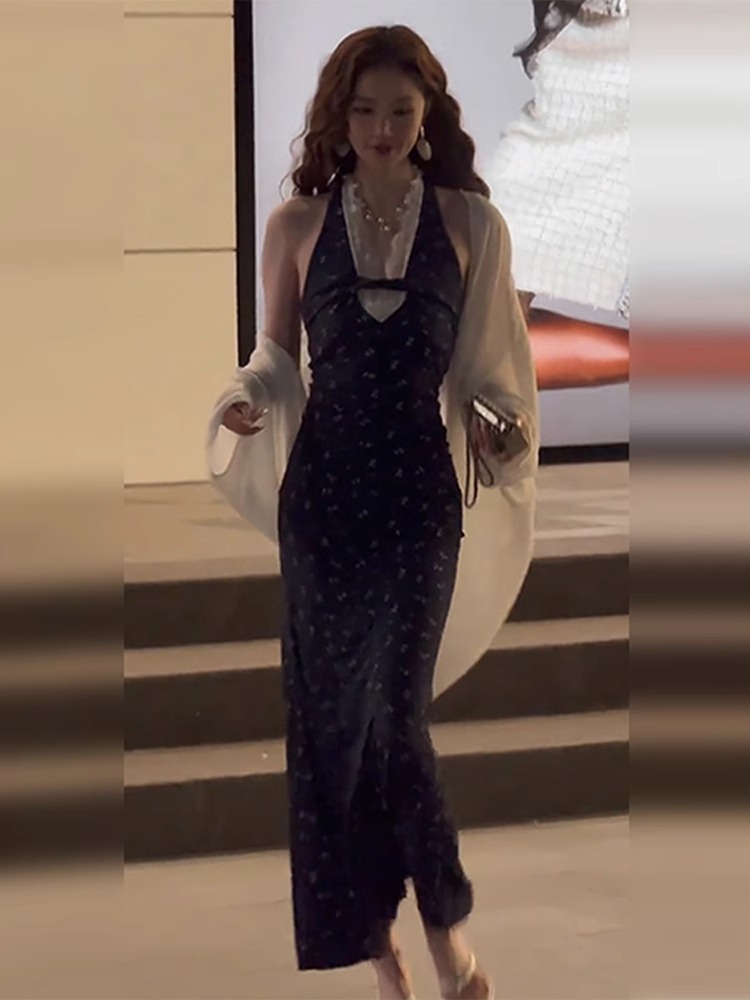 優しいフランス風の花のサスペンダーのスカートの女性2025夏の新型の気質の長いタイプの高い腰はやせているワンピースを現します。