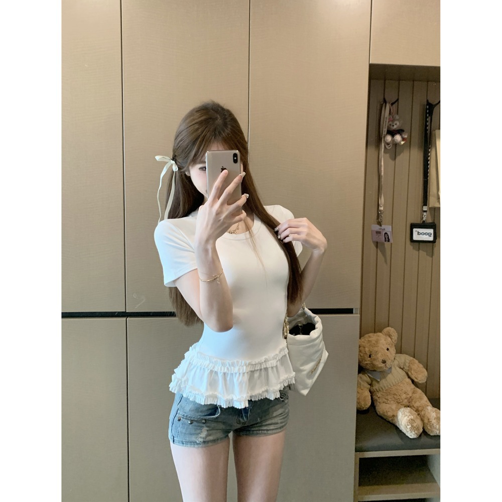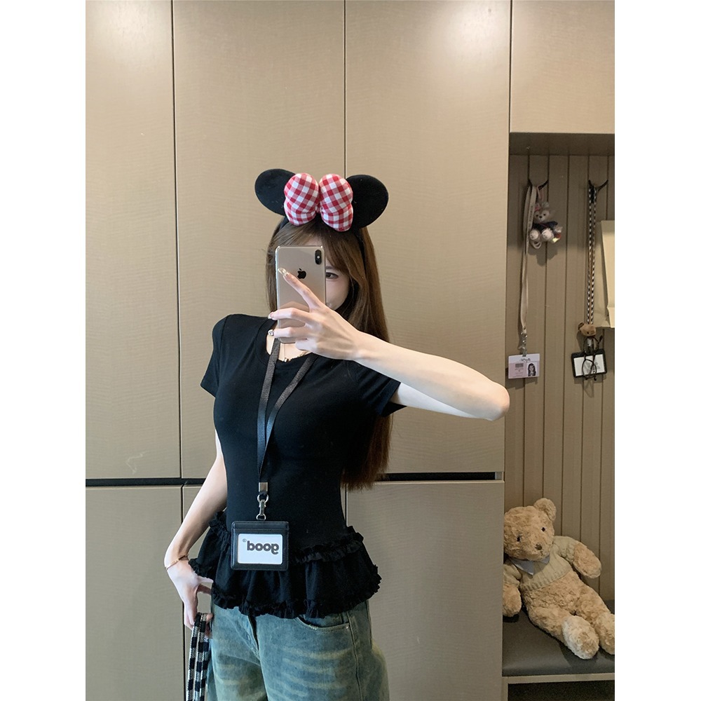 MR【レーヨン】フリルブラックラウンドネック半袖Tシャツレディース夏ニッチウエストデザインシックホワイトトップ