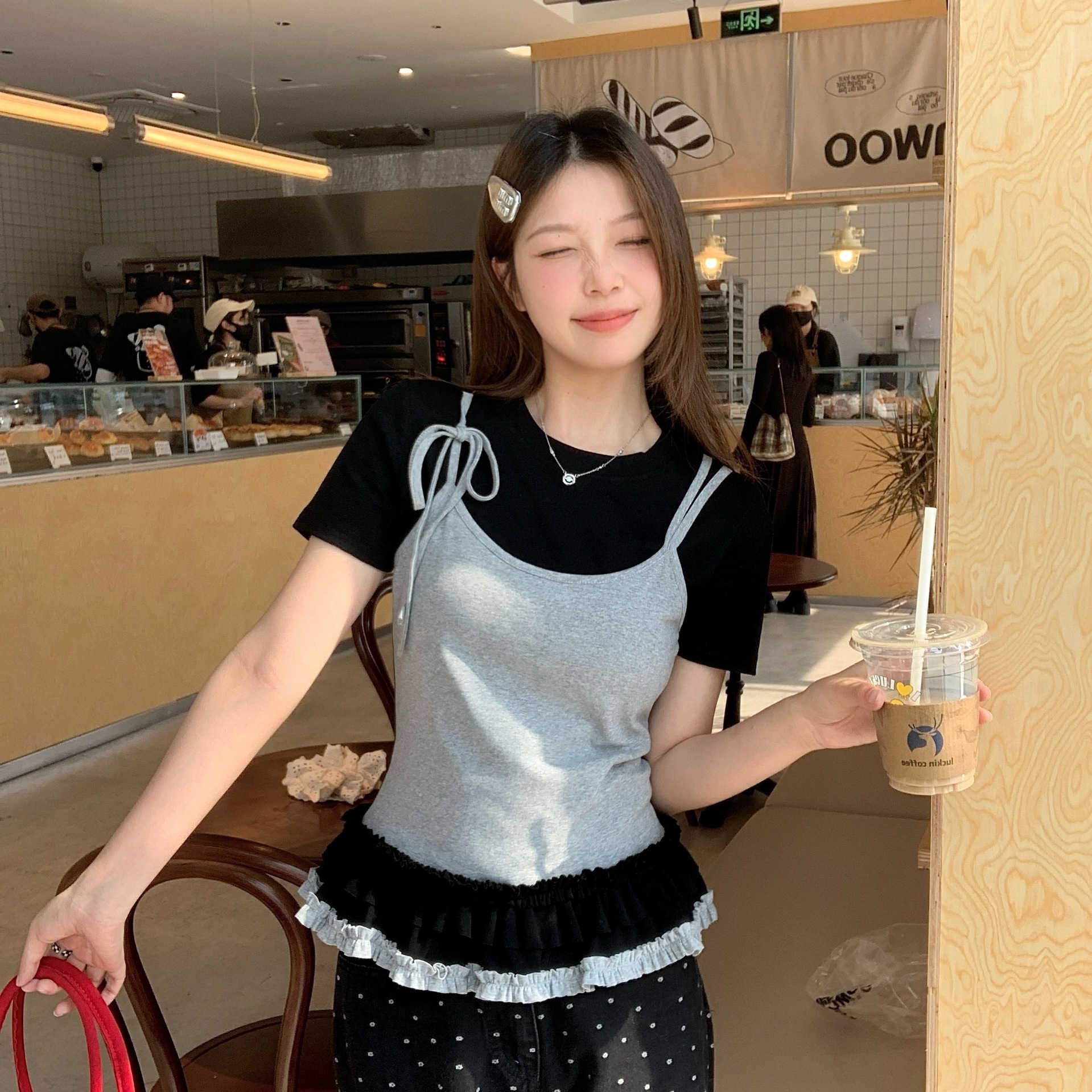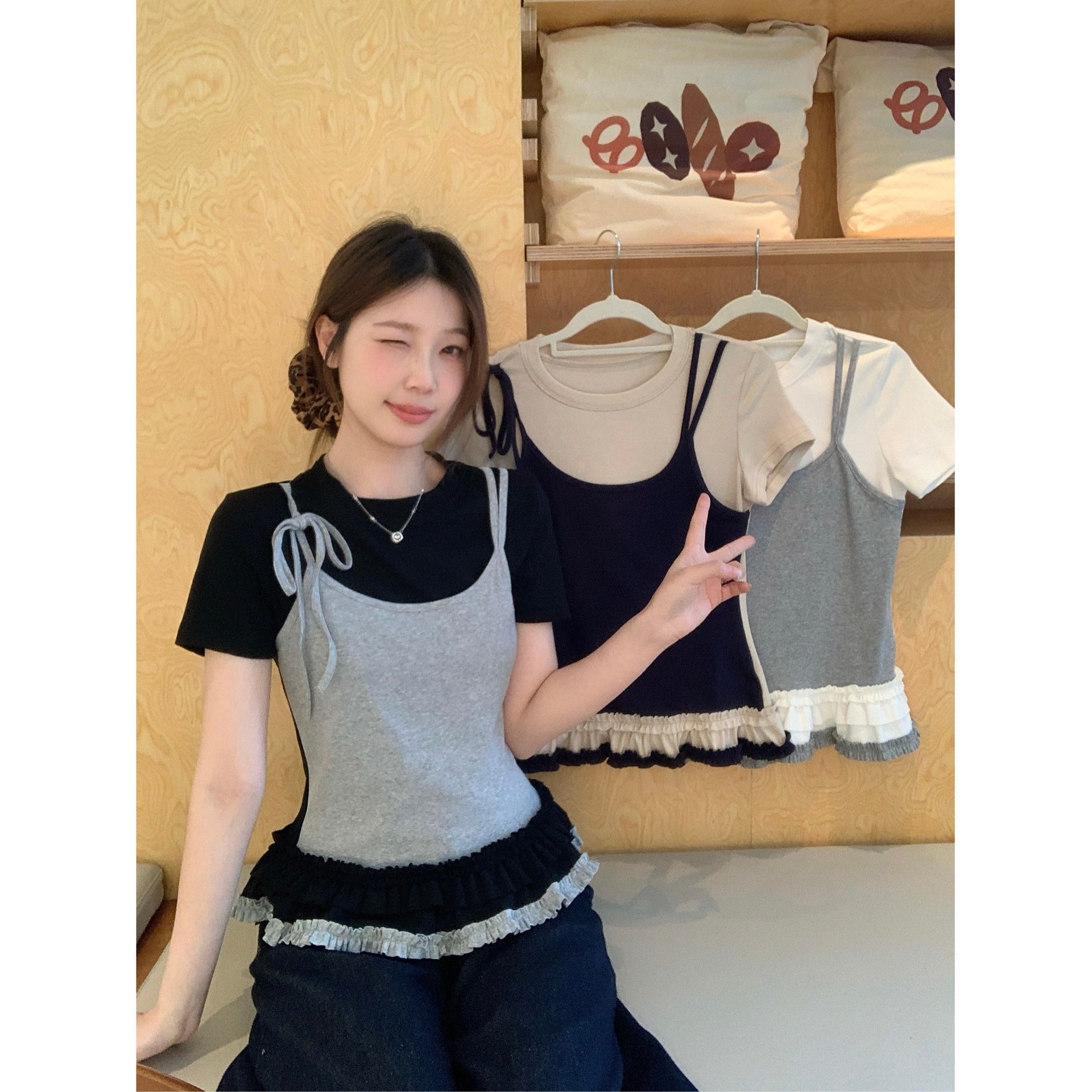 MR 【3色】韓国風フェイクツーピースサスペンダー継ぎ半袖夏甘辛ニッチ木耳トップス