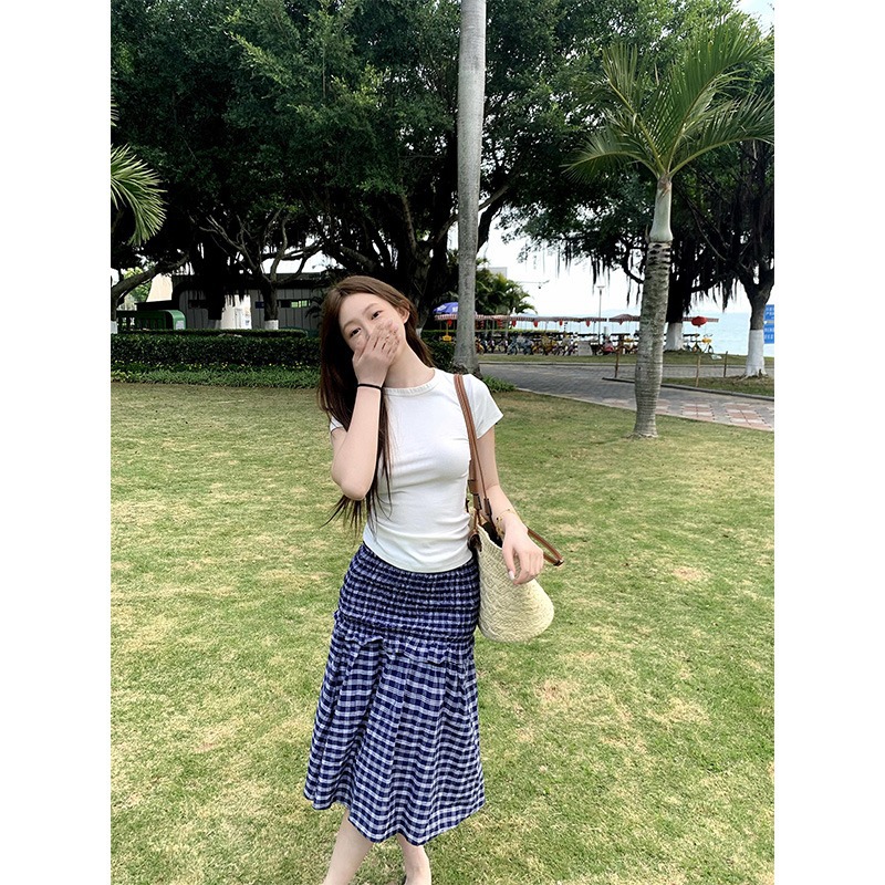 MR 【オリジナル先染めチェック柄】韓国風ブルーチェック柄チューブトップスカートベストレディーススイートAラインスカート2着
