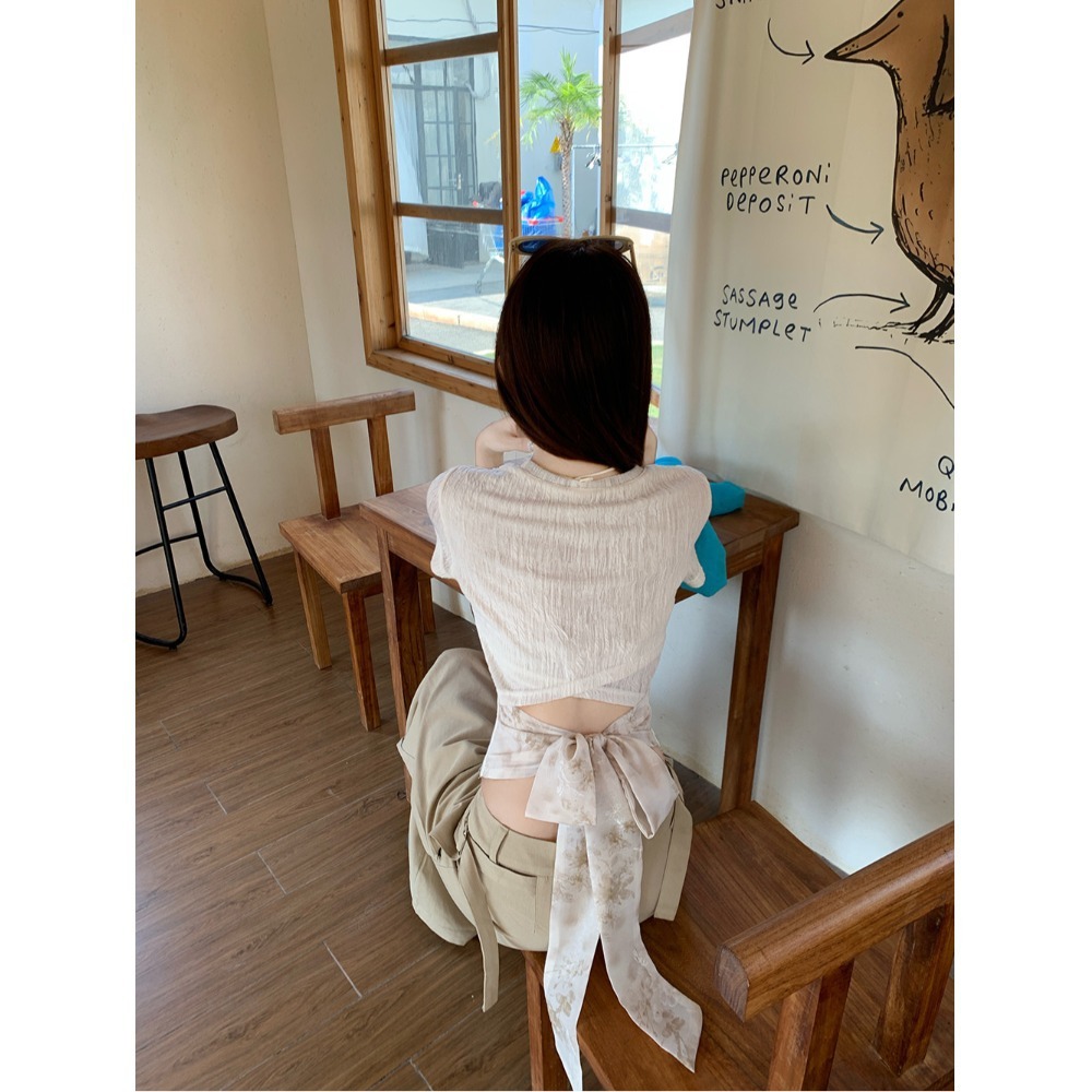 MR【樹皮鄒】デザイン感の透かし彫りの蝶結びのストラップの半袖tシャツの女性の夏の大衆は身を修めて独特です。