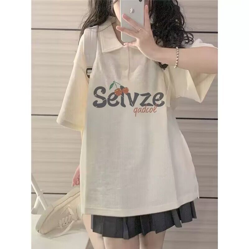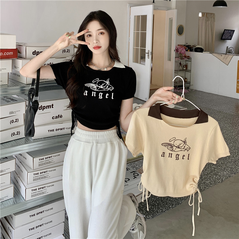 デザイン感のあるひものアルファベットのプリント半袖tシャツ女性2023夏の新型のスリムな短い上着