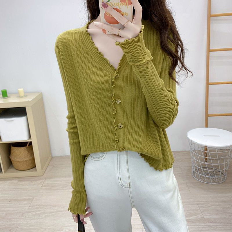 新しいサイズの春と秋の怠惰な長袖ニットの上着の薄いvネックのカーディガンのセーターの女性のショートコート