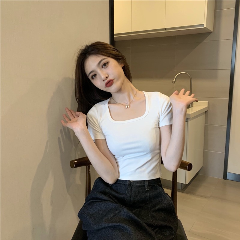 1*1 40本の純綿の方襟半袖tシャツ女性夏insの短いタイプの修身甘辛露臍の独特な上着の潮