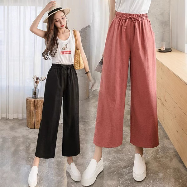 新しい女性用ワイドレッグパンツ、夏のハイウエストカジュアルスリムレースアップパンツ、ルーズイミテーションコットンとリネンのストレートパンツ