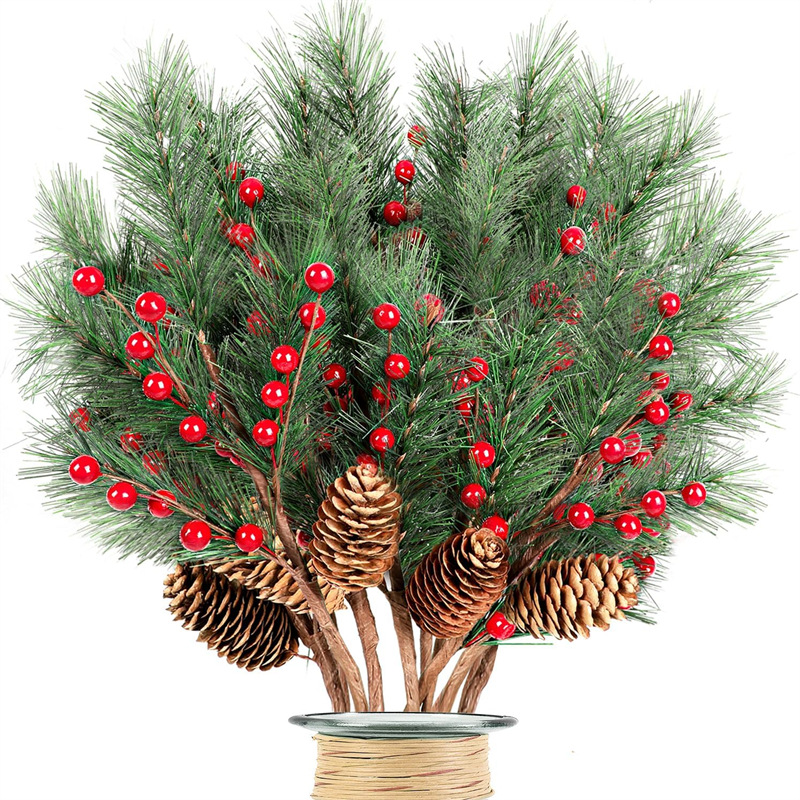 アマゾンの新しい祝日クリスマス人工松の枝に赤ベリーの偽松果冬青果四叉松針花束を配合する