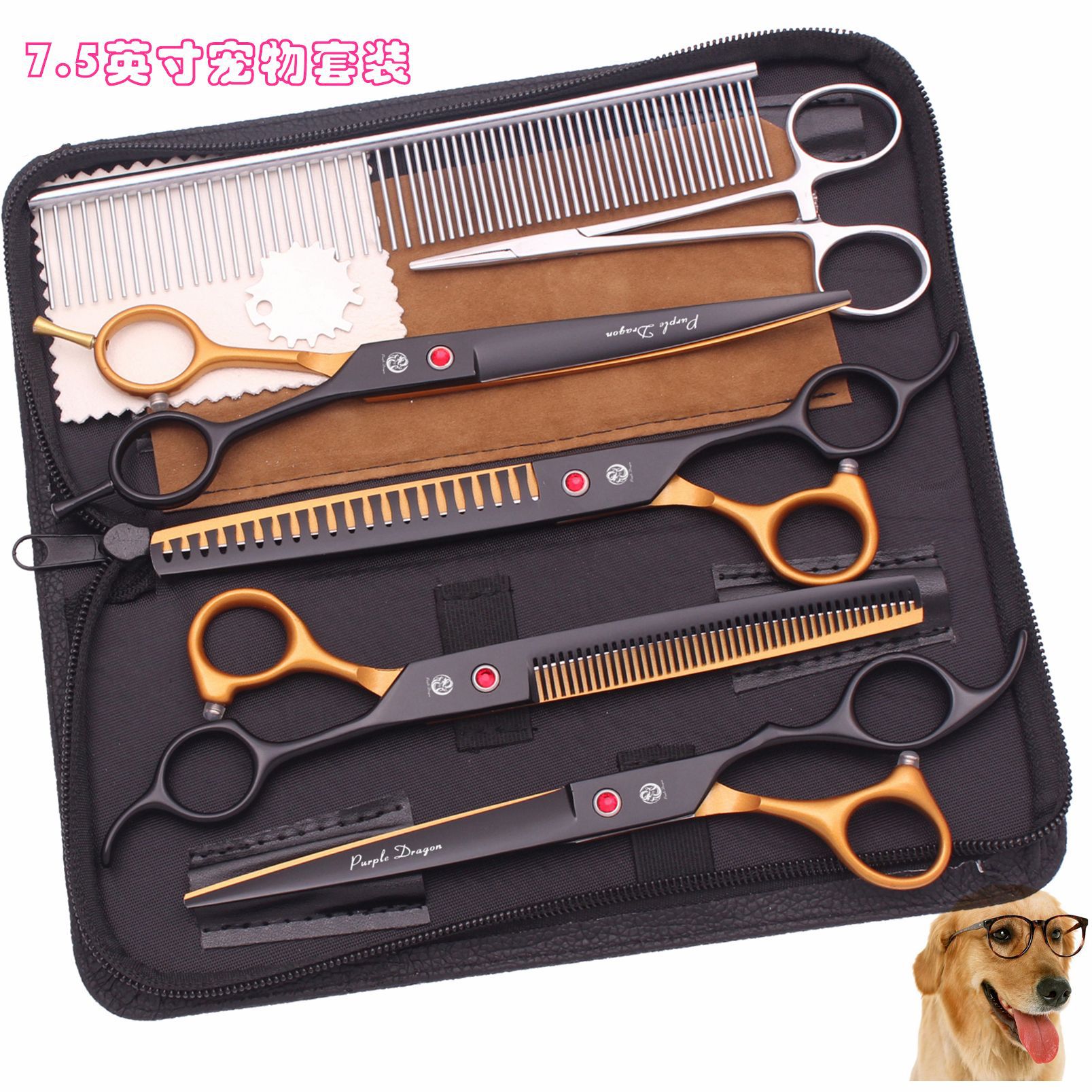 7.5インチ紫龍ペット美容ハサミ黒金直切魚骨歯切金毛貴賓打薄セット