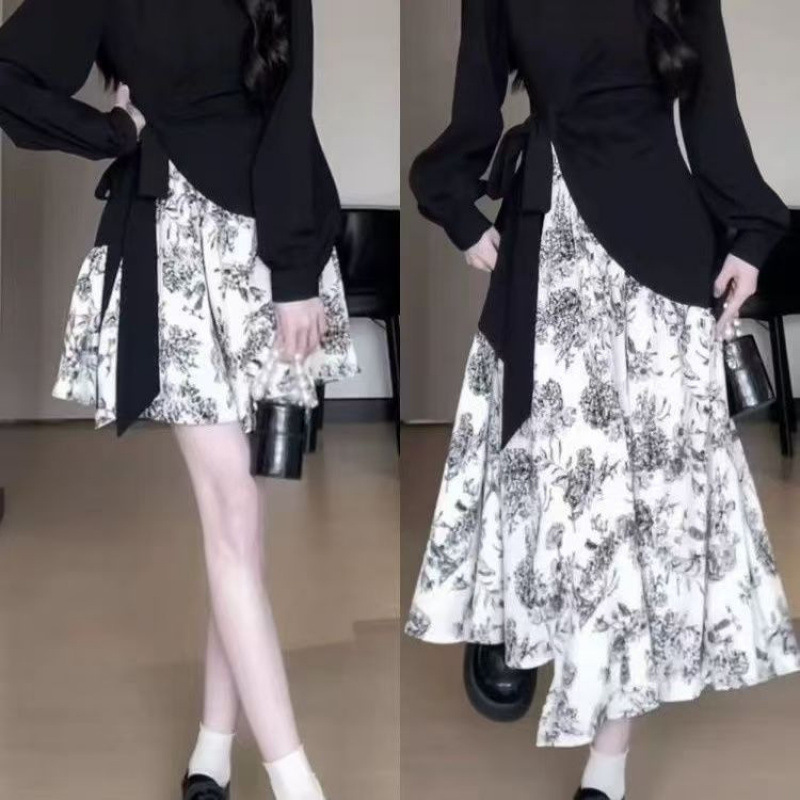 秋の装いの新型中国風水墨の花は長袖のワンピースをつづり合わせて見せます。