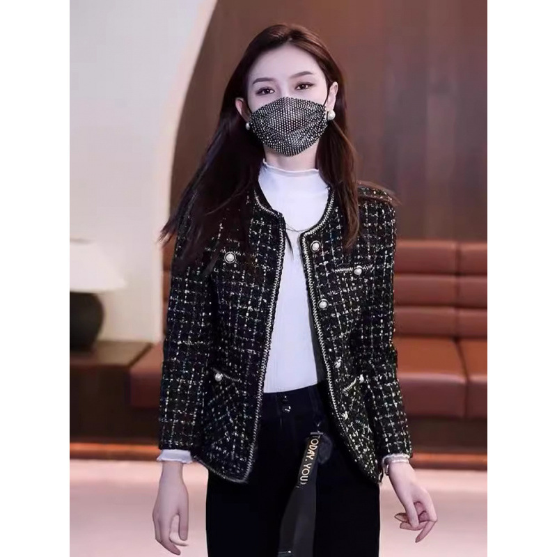 ネットの赤い新型はやせていて身を修める上着の丸首の春の服の新型の長袖の格子の小さい香りの風の高級なコートの女性の短い金を見せます。