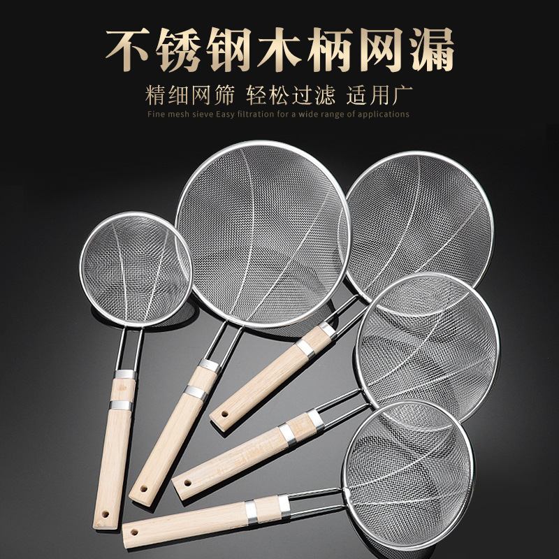 ステンレスの木の柄の大きいネットはホテルの揚げ物を漏らしてスプーンのレストランの用品の料理道具のポテトチップスの濾過ネットをすくい取ってギョーザのザルをすくいます。