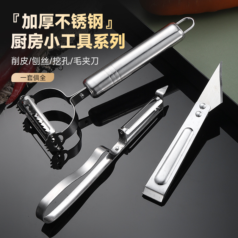 ステンレス鋼の皮むきナイフの台所の多機能の皮むきの果物の刀のジャガイモのおろし器のアヒルの毛の挟みの3つのセットの卸売り