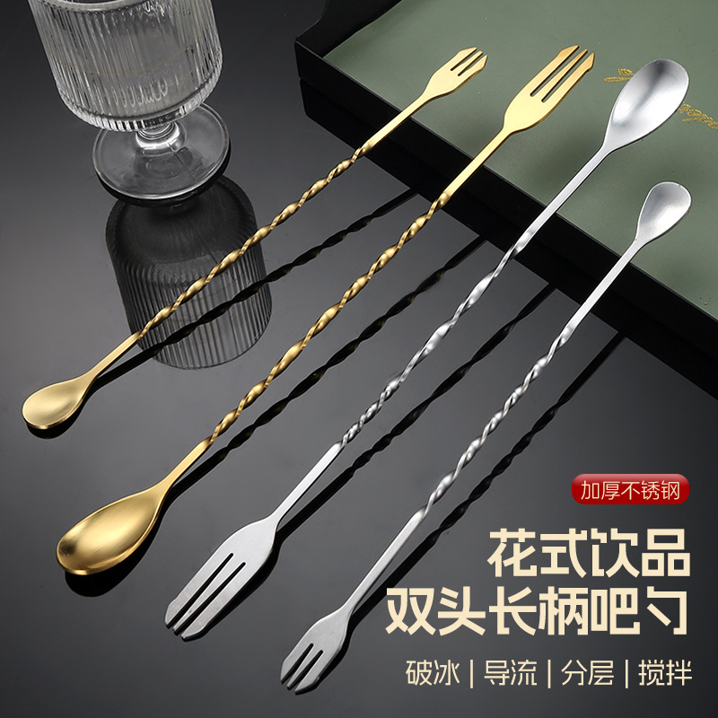 ステンレスの長い柄のスプーンはカクテルのミルクティーのコーヒーを調製してスプーンをかき混ぜます。
