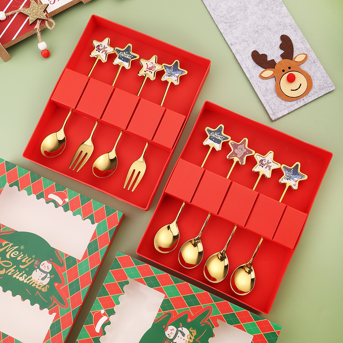 Sクロスボーダークリスマス漫画スプーンステンレスゴールドペンダントスプーンフォークコーヒースプーンギフトボックス攪拌デザートスプーンフォーク