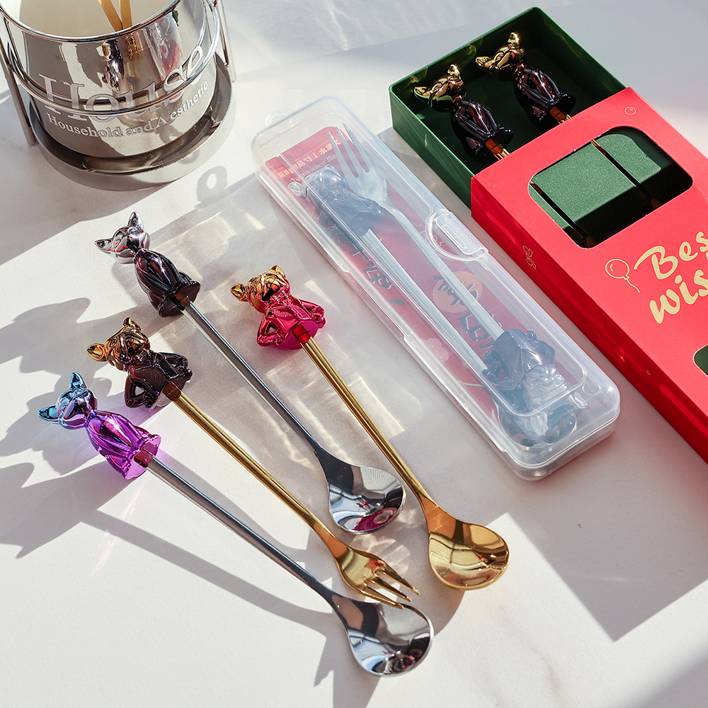 Sかわいいスプーンフォークセットクリエイティブ子猫自慢の人形食器ネット赤攪拌スプーンコーヒースプーンステンレススプーン