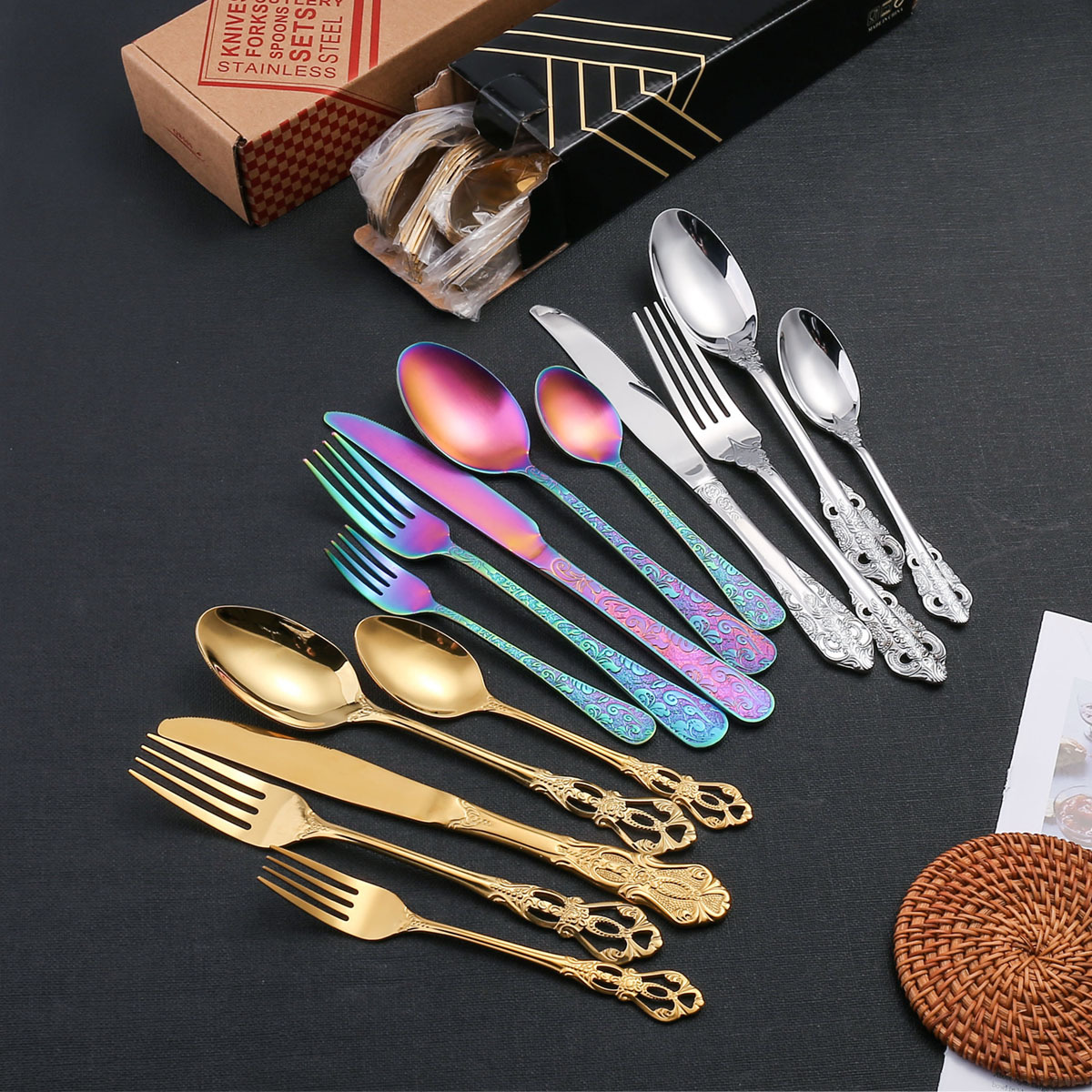 Sクロスボーダーステンレス食器ナイフフォークスプーン四点セット金色ナイフフォークスプーンクラシック黒セットプレゼント