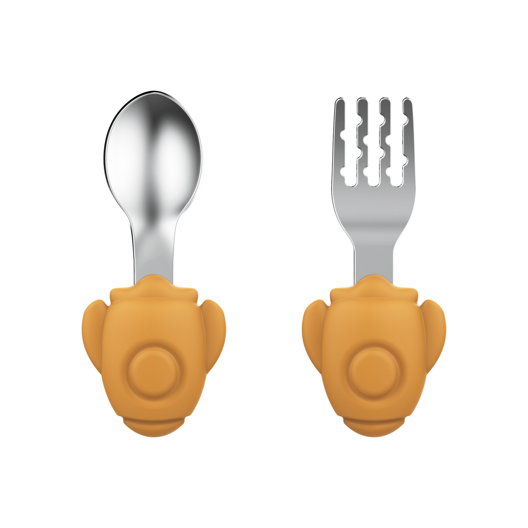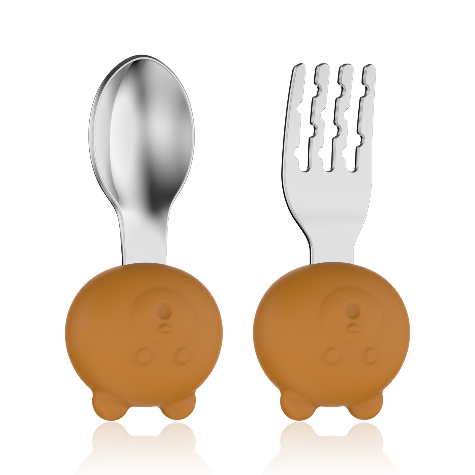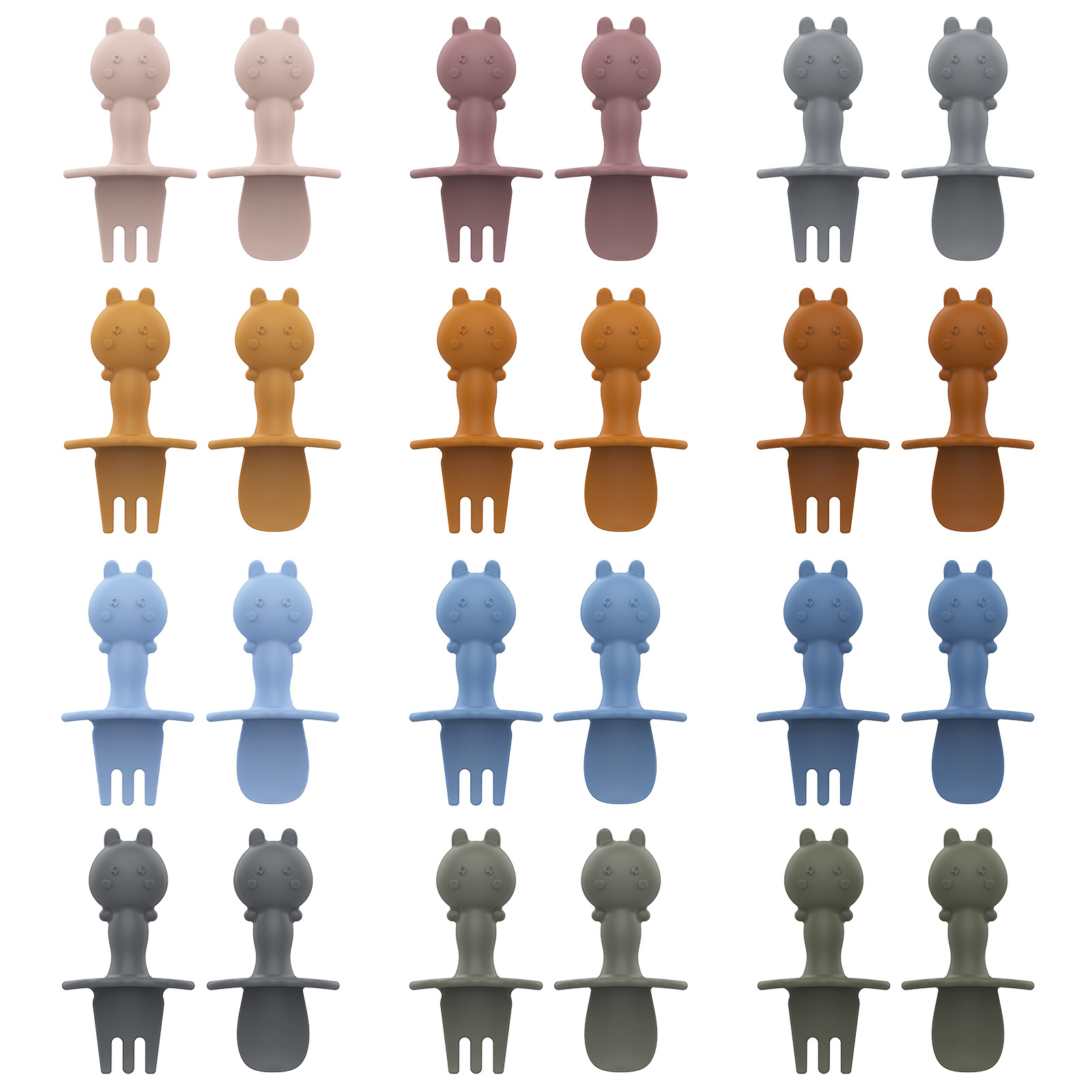 漫画の熊の赤ちゃんのシリカゲルの短い柄の食器の304ステンレスの子供のフォークのスプーンの幼児の補助食の食事の訓練のスプーン