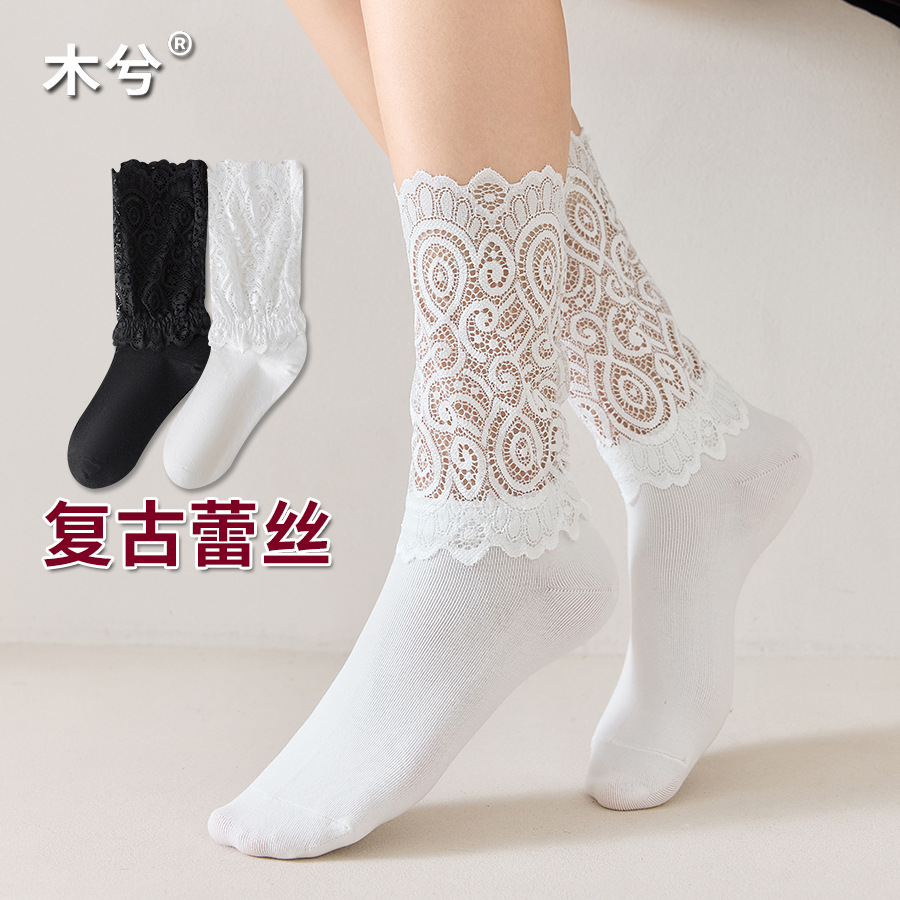 ネットセレブソックス女性イン黒と白のロングソックス甘いロリータレースレディースミッドカーフソックス夏 JK トレンドソックス