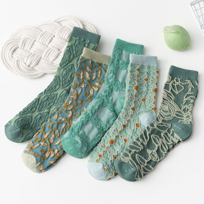 靴下の女性の中筒の靴下の春と秋の薄いタイプのinsのファッションの緑色のレリーフは汗のストッキングの秋冬の綿の女性の靴下を吸います。