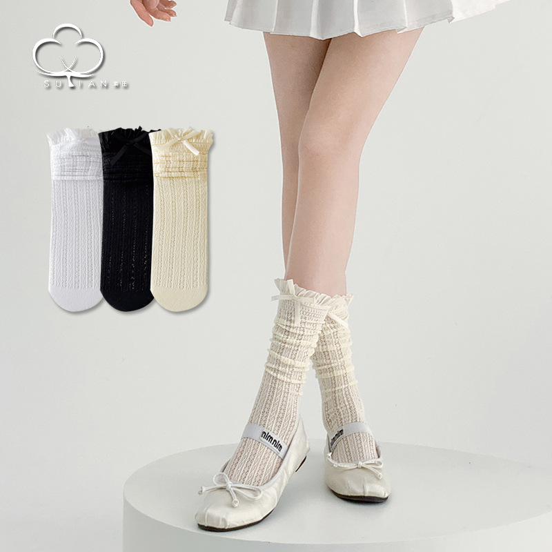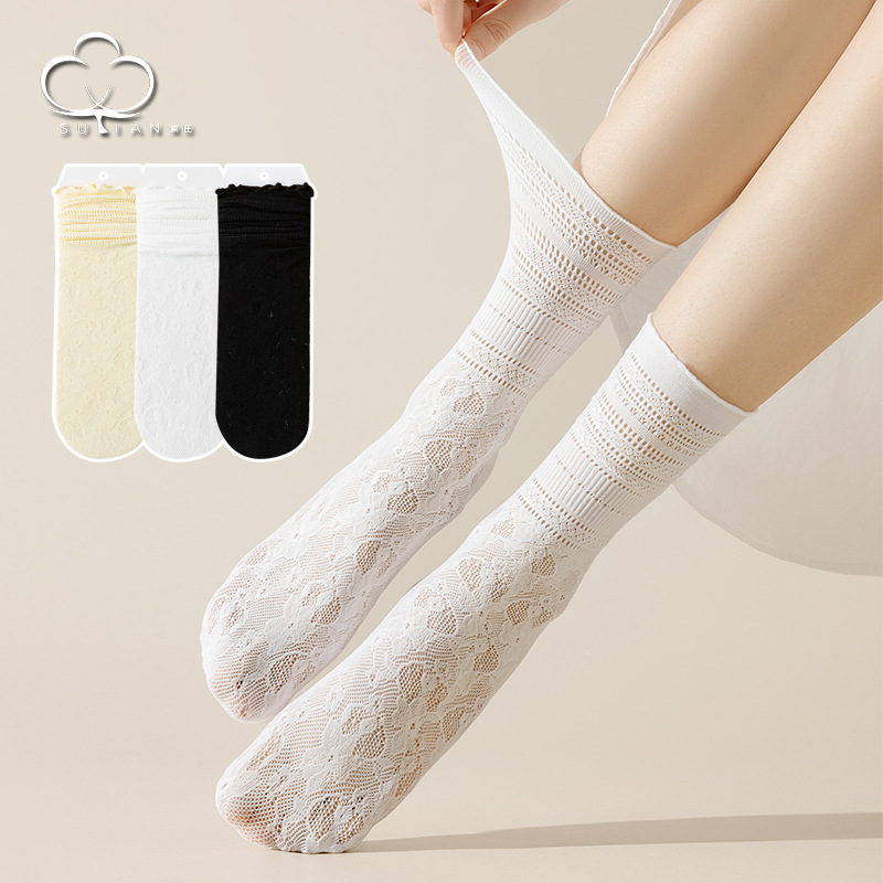 レースの靴下の女性の夏の薄い靴下の女性の中筒の靴下の透かし彫りの通気性の木の耳の辺の長い筒のストッキングはかわいいです。