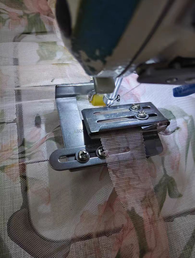単針ミシンで上部をしわくちゃにして下部を平らにし、コンピューターミシンで上部をしわくちゃにして下部を平らにし、二層の継ぎ目を作ります。