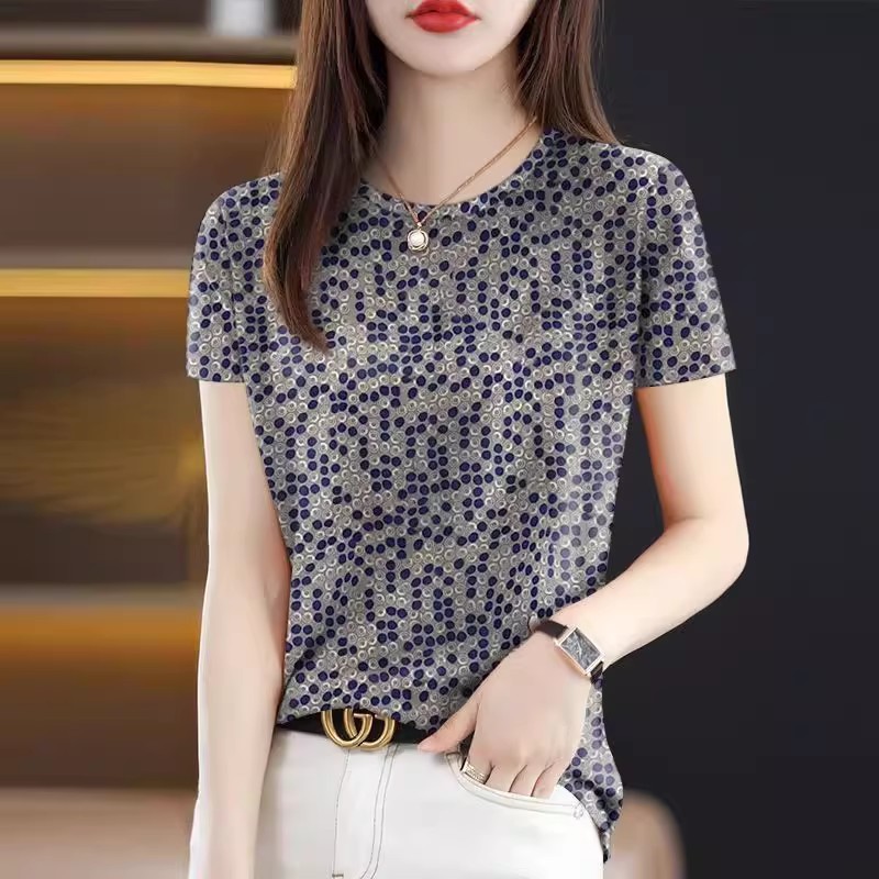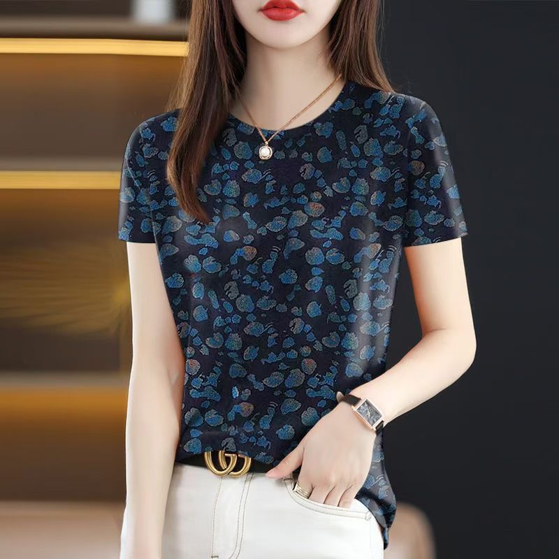 クリアランスセール~夏のファッションラウンドネック半袖Tシャツレディースカジュアル万能アイスシルクプリントルーズスリミングトップ