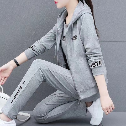 カジュアルなスポーツウェアのスーツの女性2023秋の薄いセーターの3点セットの帽子付きベストコートのランニング服の女性のファッション