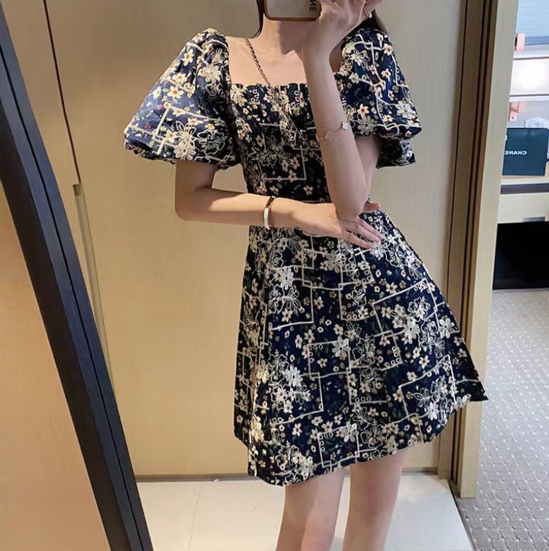 小さいデイジーの花のワンピースの婦人服の夏の新型の名媛の気質の復古の方襟の泡の袖の短いスカートのins