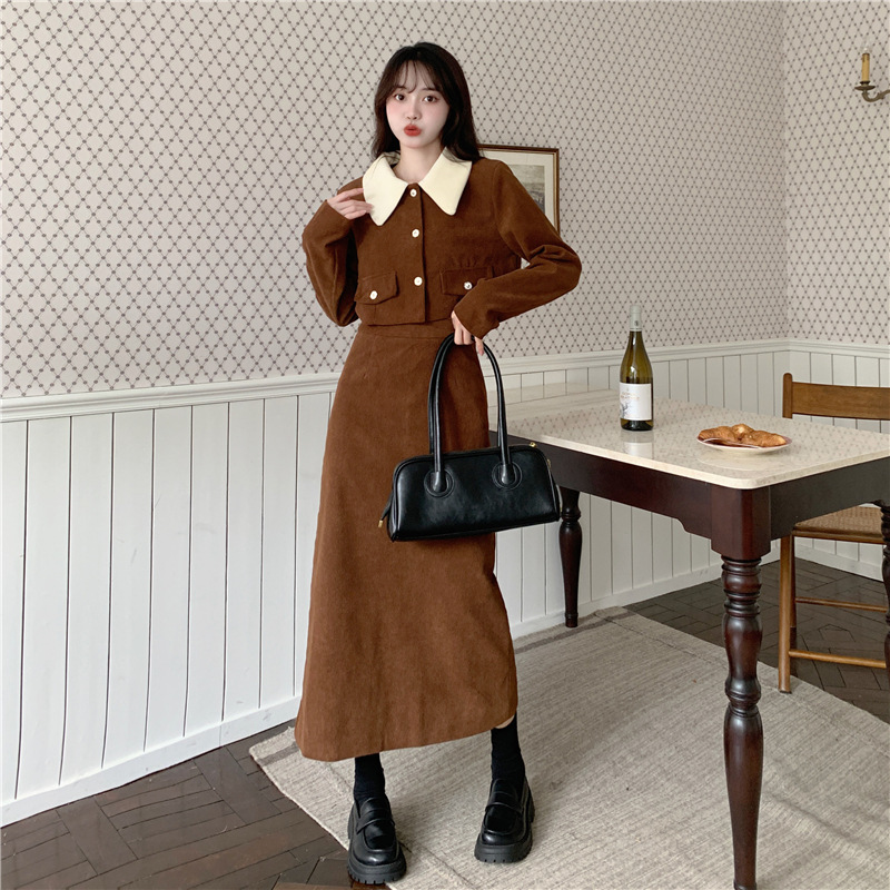 コーデュロイ2点セット秋冬新作ビッグサイズ高級感減齢気質小香風コート半身ロングスカートセット