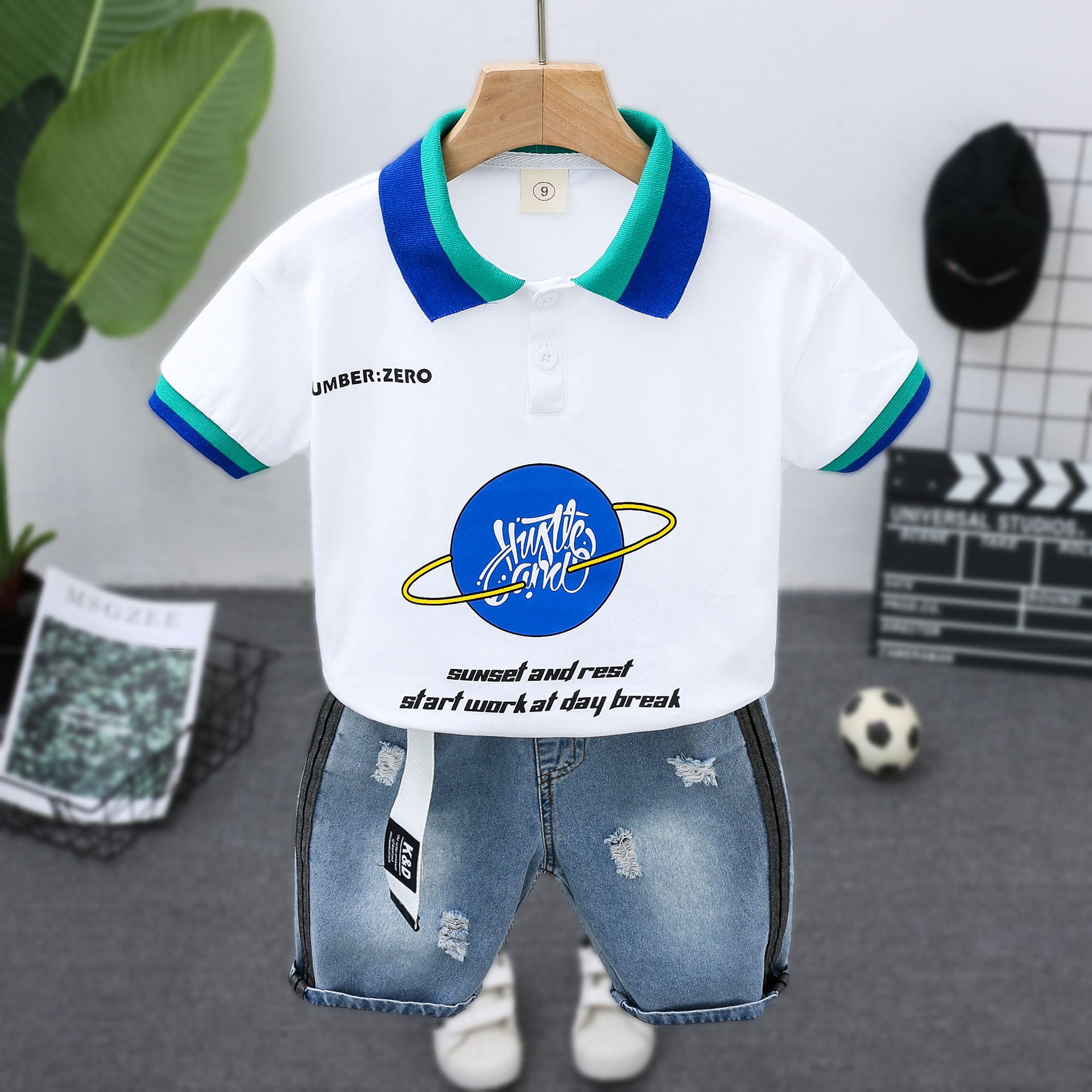 2023 夏の子供服新しいスタイルボーイズカジュアルユニバースラペル Tシャツ + デニムパンツスーツ中大子供用 2 点セット