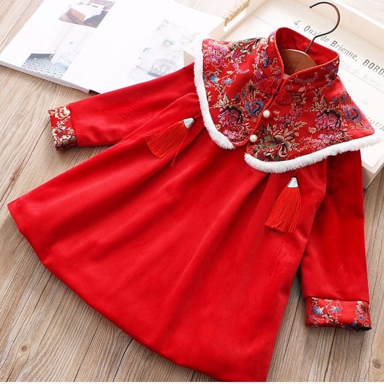お祝い新年子供チャイナドレスプラスベルベットドレスショール女の子漢服新年服新年チャイナドレス少女
