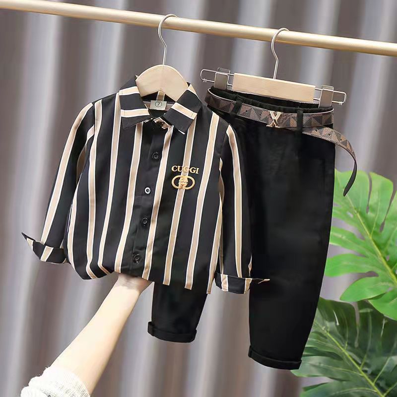 2021 ボーイズ秋スーツ韓国ファッションストライプ長袖シャツ黒と白の弾性カジュアルパンツ 2 点セット