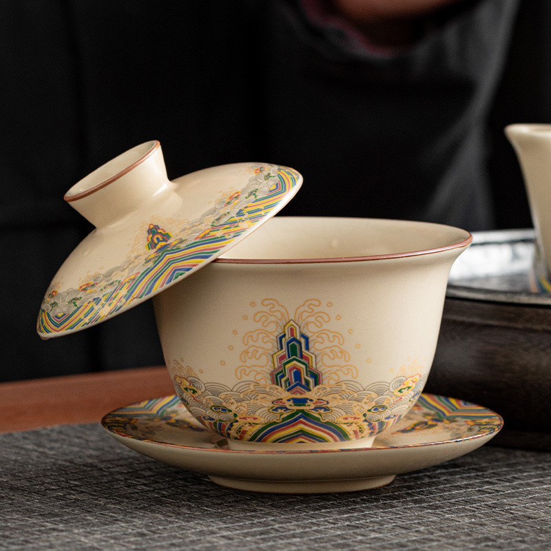 汝窯懸垂三才蓋碗茶杯高級茶碗蓋付泡茶工夫茶器海水江崖陶磁器敬茶