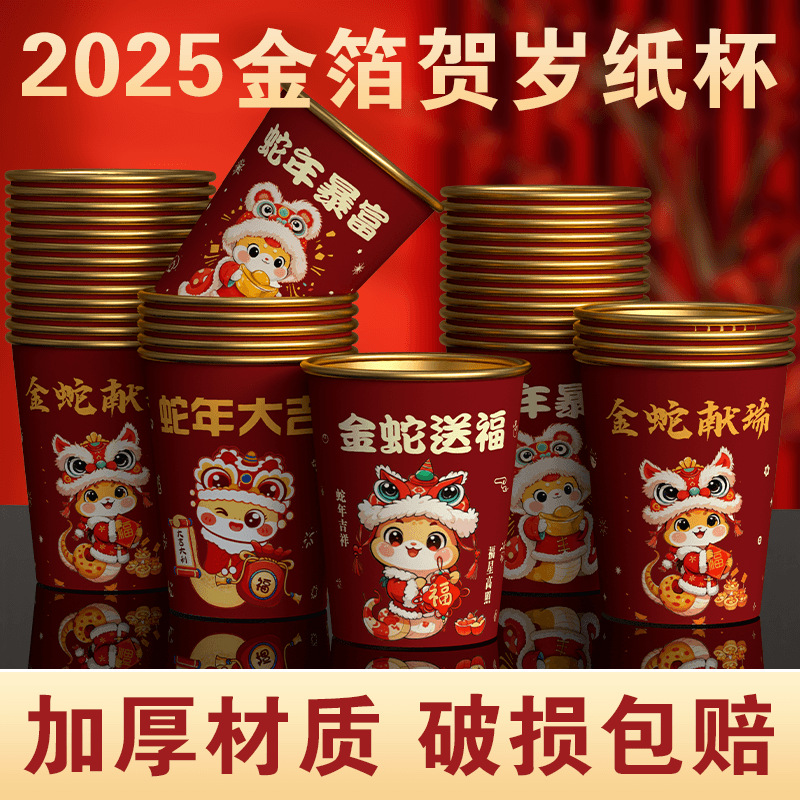 2025蛇年金箔紙コップ使い捨て紙コップ特別厚家庭用新年生肖賀歳旧正月紙コップ