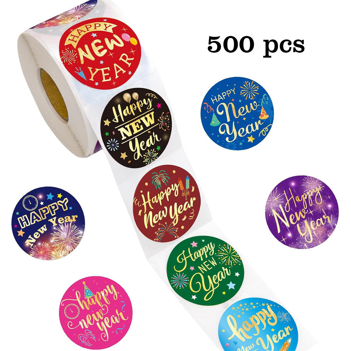 越境新年おめでとう丸型箔押しシールカラフル花火ロールシールギフト包装美化装飾ステッカー