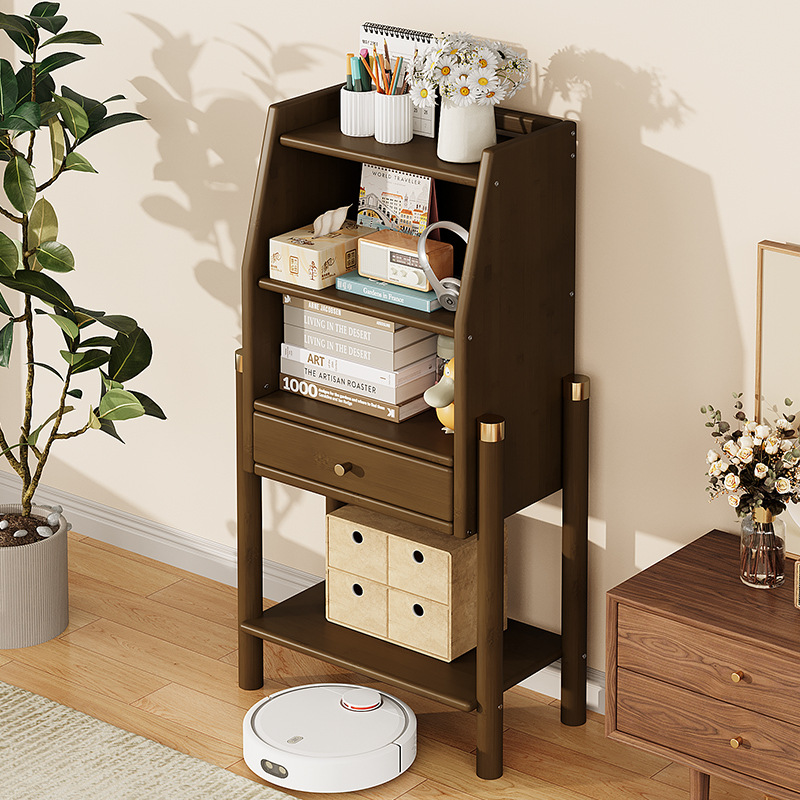 家庭用の小さな本棚が床に落ちている簡単な子供の本棚のリビングルームのテレビのそばに壁のサイドキャビネットの多層のシンプルな棚があります。